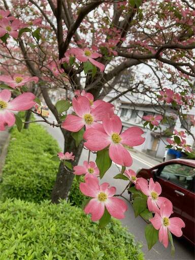 いつもと違う道を通ると、きれいなハナミズキの花が咲いていました。